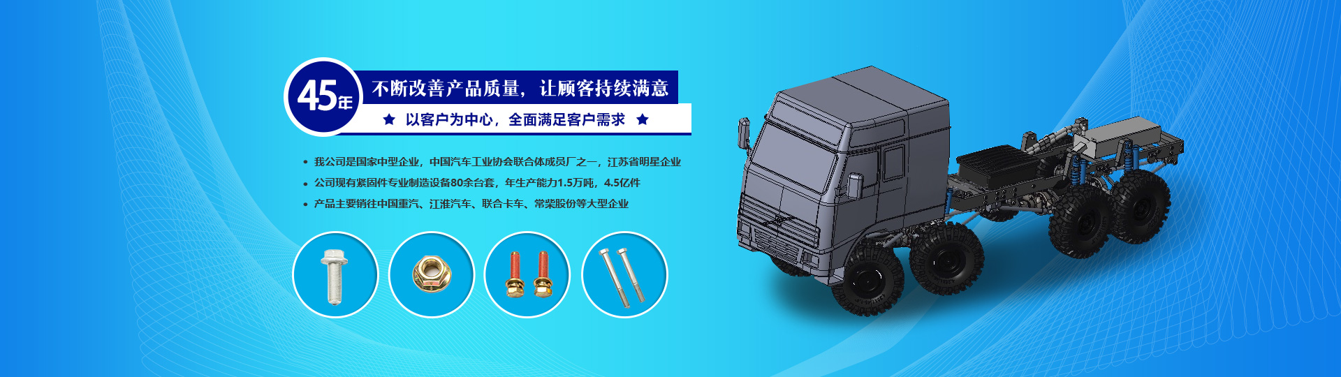 鎮(zhèn)江市標力緊固件有限公司是國家中型企業(yè),中國汽車工業(yè)協(xié)會聯(lián)合體成員廠之一,江蘇省明星企業(yè),位于江蘇省鎮(zhèn)江市諫壁鎮(zhèn)。 目前專業(yè)生產(chǎn)各類型螺栓、螺母、鉚釘、銷軸、墊圈及各類非標準件產(chǎn)品,產(chǎn)品注冊商標為“BL”牌。